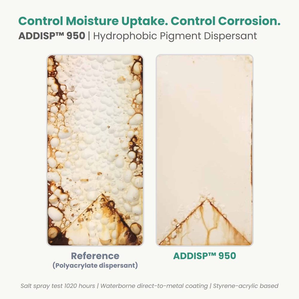 ADDISP™ 950 is an efficient and hydrophobic dispersing and wetting agent for VOC-compliant aqueous and non-aqueous systems. Universal dispersant for many types of pigments. It improves colour strength, reduces flocculation, flooding, and storage stability through steric stabilisation. Suitable for the preparation of universal pigment concentrates. Ideally suited for formulations where low water sensitivity is critical, including DTM, industrial, and marine coatings.