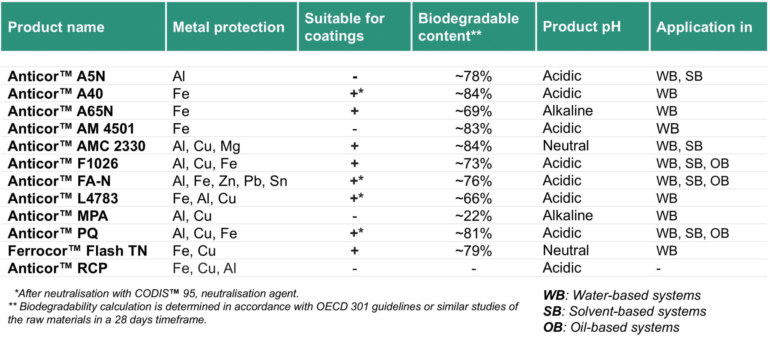The range includes anti-corrosive additives for aluminium, copper, magnesium, brass, and ferrous surfaces. The Anticor™ product range finds applications in water-based and solvent-based systems, depending on the Anticor™ grade.